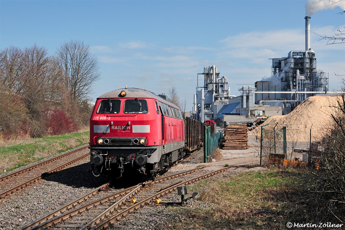 Nach der Zustellung von ein paar leeren H-Wagen an der Spanplattenverladung nimmt 225 008 am 20. April 2013 den Anstieg zum Streckengleis beim Eggerwerk in Angriff, um kurz darauf mit dem Leerwagenzug mit Zielbahnhof Schwerte die letzte Etappe des samstäglichen Sonderdienstes zu beginnen.