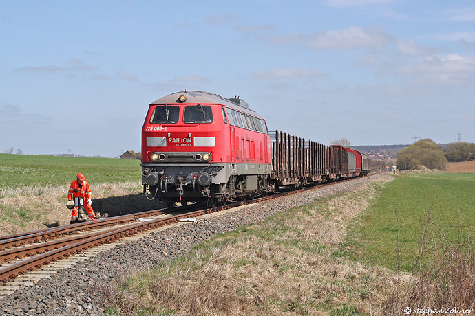 Die Übergabe zum Eggerwerk wird für die Rückfahrt nach Schwerte in der Regel im Anschluß 3 umgesetzt. Nach Abstellen einer beladenen Fuhre Rohholzwagen hat 225 008 am 20. April 2013 die Leerwagen aufs Streckengleis gedrückt, der Rangierer verschließt gerade die Anschlussweiche.