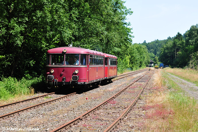 Zum 60-jährigen Bestehen des Jugendwaldheims Ringelstein kam auch dieser Schienenbuszweiteiler zum Einsatz. Zug 4 verlässt hier soeben den Bahnhof Ringelstein und somit den Betriebsmittelpunkt der Waldbahn Almetal e.V. Richtung Büren. Gleis 3 wurde hingegen zuletzt ein Jahr zuvor von einer hier umsetzenden Lok eines Trafotransports befahren und hat schon dickeren Rost angesetzt.