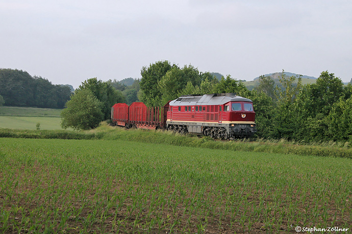 Die Kurve am Briloner Golfplatz bietet spätabends als einzige Stelle zwischen Eggerwerk und Brilon Wald noch etwas Seitenlicht für Aufnahmen von Zügen Richtung Ruhrtal. EBS 132 334 konnte so um kurz nach halb Neun am 08. Juni 2016 mit einem Leerholzzug nach Mecklar dort abgelichtet werden. Die Schublok EBS 232 239 blieb derweil in der üppigen Vegetation verborgen.