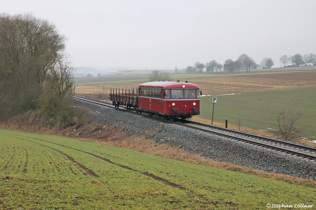 Typisches Sauerländer Mistwetter herrschte am 16. Februar 2017 vor, als 798 576 der Eifelbahn Verkehrsgesellschaft zur Abholung der Neuerwerbungen in Form der ex-Schienenbusse sowie des Skl der Waldbahn Almetal im Sauerland erschien. Aufnahme im Bahnhofsteil Egger Rekostein im Briloner Spansfeld.