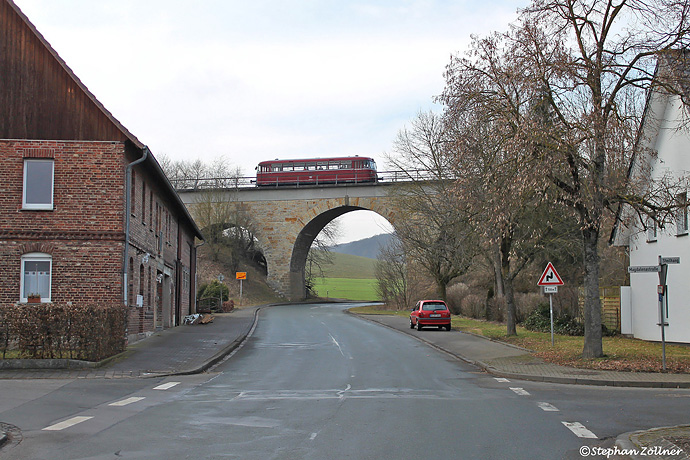 Ruhig und beschaulich geht es im Örtchen Weine im Almetal zu. Am 16. Februar 2017 unterbricht mit 798 576 auf seiner Fahrt nach Büren-Weinberg noch ein vorletztes Mal ein Schienenfahrzeug kurz die Stille, als dieser den dortigen kleinen Viadukt überquert.