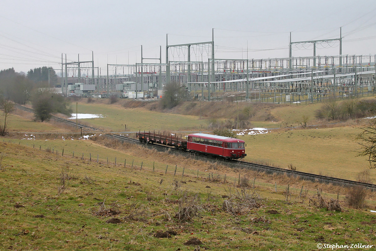 Nach zwei Jahren Stillstand und keiner absehbaren Perspektive wurden die beiden Schienenbusse und der Skl der Waldbahn Almetal Anfang 2017 an die Eifelbahn Verkehrsgesellschaft aus Linz verkauft. Am 16. Februar 2017 rückte deren 798 576 zur Abholung im Almetal an. Hier konnte der VT bei sehr bescheidenem Wetter mitsamt Schutzwagen am Nehdener Umspannwerk aufgenommen werden. Im Hintergrund sind die Bauarbeiten zur Erweiterung der 380 kV-Anlage deutlich zu erkennen.