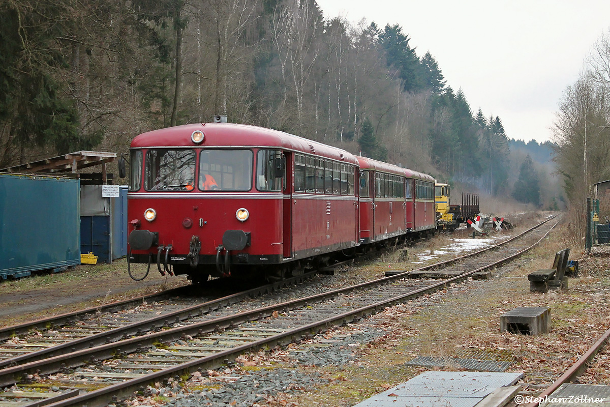 Der letzte Akt im Almetal: 798 576 der Eifelbahn Verkehrsgesellschaft holt am 16. Februar 2017 seine von der Waldbahn Almetal angekauften Brüder 798 729 und 798 766 samt des Skl 53-0749 in die neue Heimat nach Linz am Rhein ab. Aufnahme des Gespanns samt Schutzwagen vor der Abfahrt in Ringelstein, welche erst nach Einbruch der Dunkelheit erfolgte.