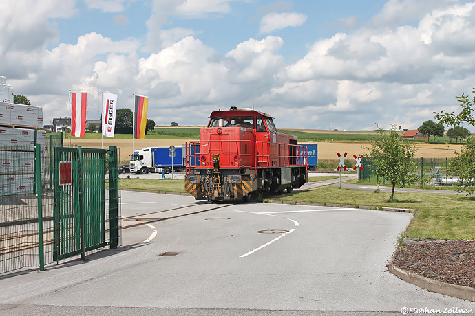 Am Wochenende 21. ⁄ 22. Juli 2017 brachte die HLG Holzlogistik + Güterbahn Bebra einen Rohholzzug von Bebra (ab Warburg in zwei Zugteilen) zum Eggerwerk. Samstagnachmittags war gegen viertel vor Zwei auch der letzte Wagen entladen, sodaß sich die G 1206 von ihrer Warteposition vor dem Werkstor zum Rangieren Richtung Holzplatz aufmachte.