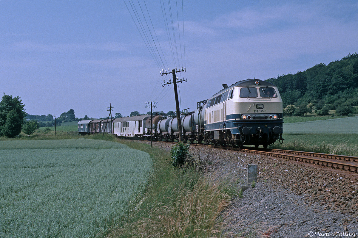 Als im Sommer 1989 die jährliche Tour zur Unkrautbekämpfung am Briloner Hölsterloh unterwegs ist, heißt der Zielbahnhof der Fahrt noch Alme und von der neuen Trasse der Ortsumgehung B 251 n sowie vom Briloner Golfplatz ist weit und breit noch nichts zu sehen. Die Eckeseyer 218 141 passiert die Idylle mit intakter Telegrafenleitung. Damals alles noch Alltag. Heute ist man doch froh, seinerzeit entsprechende Aufnahmen angefertigt zu haben.