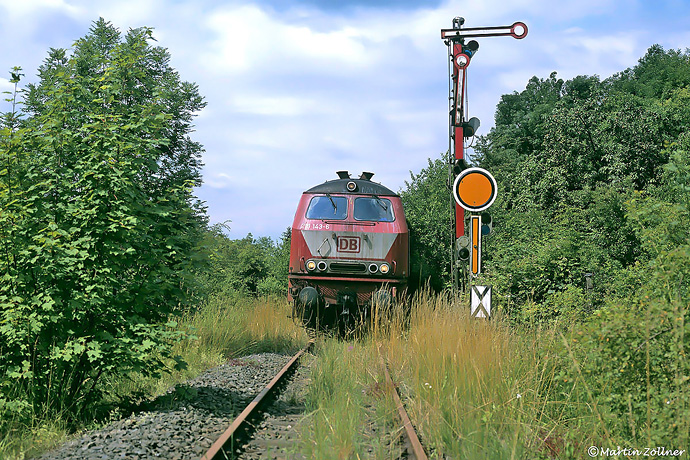 20 Jahre, nachdem hier das letzte, mit Braunschweiger 216 bespannte Eilzugpaar verkehrte, stattete die arg heruntergekommene 218 143 am 14. Juli 2004 dem im Dickicht in Streckenkilometer 284,2 gelegenen Scherfeder Einfahrtsignal G einen Besuch ab. Zu diesem Zeitpunkt war auch das zuletzt im Güterverkehr bediente Streckenstück Scherfede – Nörde der ehemaligen Kursbuchstrecke 249 bereits ein Jahr offiziell stillgelegt.