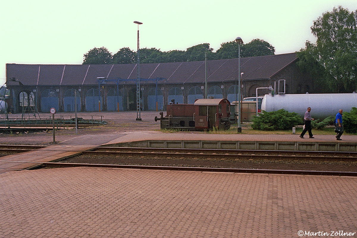 Im Jahre 1982 wurden erste Fototouren mit dem Tramper-Monats-Ticket unternommen. Am Abend des 04. August erfolgte die Rückfahrt von Braunschweig aus mit dem der alten Route der Bergisch-Märkischen Bahn folgenden E 2942 via Holzminden – Scherfede nach Neheim-Hüsten. In Holzminden hatten die Bw-Mitarbeiter gerade Feierabend, als aus dem Zug heraus die Bw-Lok 324 014 vor dem teilweise als Bushalle genutzen Rundschuppen aufgenommen wurde.