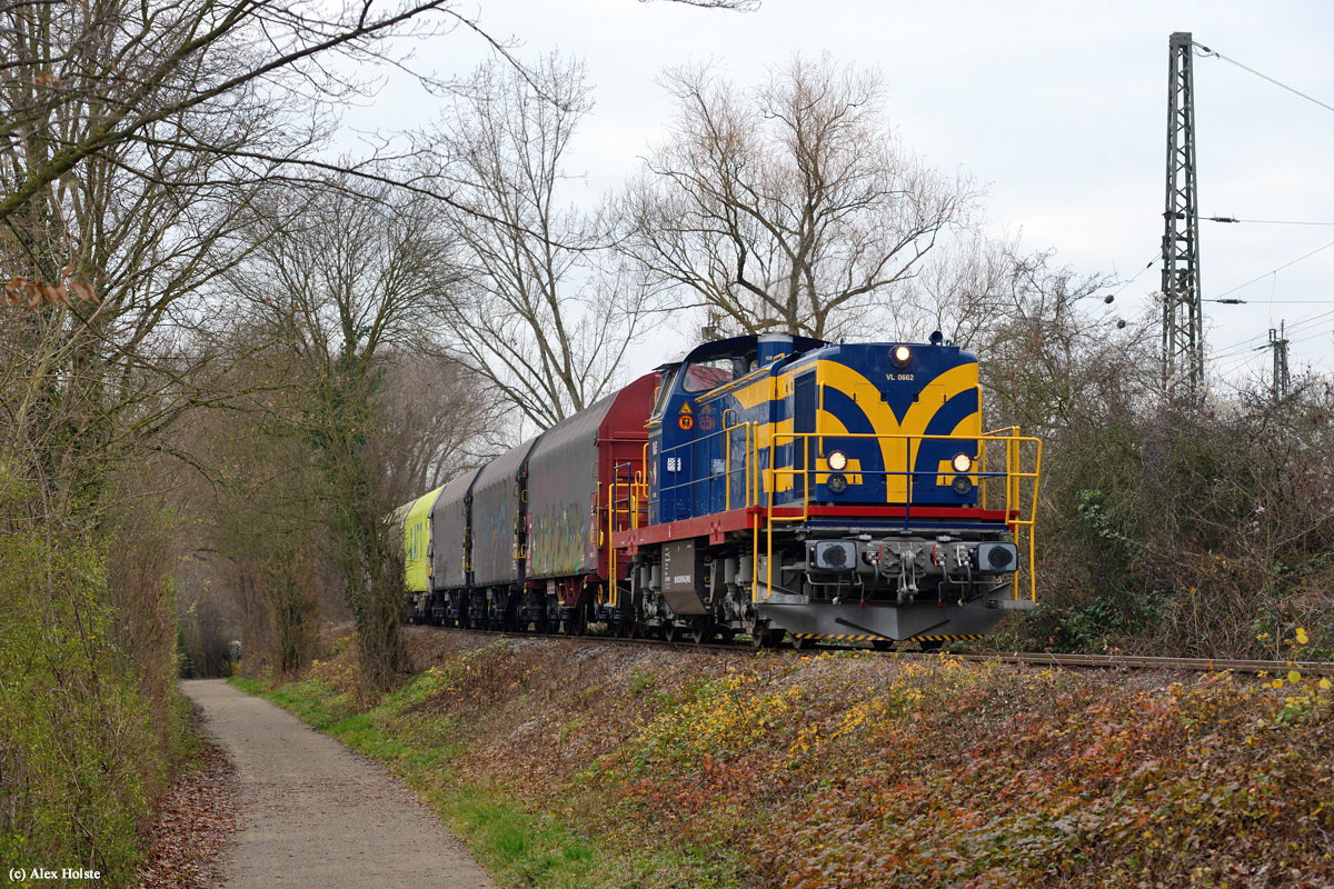Am 07.03.2019 wurde das reaktivierte Industriestammgleis in Ahlen zur Fa. Wilhelm Haver & Sohn von der WLE wieder in Betrieb genommen. Seitdem werden i.d.R. drei mal wöchentlich bis zu 28 Schiebeplanenwagen, die von einem Zug von Beddingen im Ahlener Güterbahnhof abgesetzt werden, zugestellt. Am 17.12.2025 war Alex Holste dort zugegen und lichtete die frisch untersuchte und neu lackierte WLE 62 auf dem Weg zum Coillager dort ab.