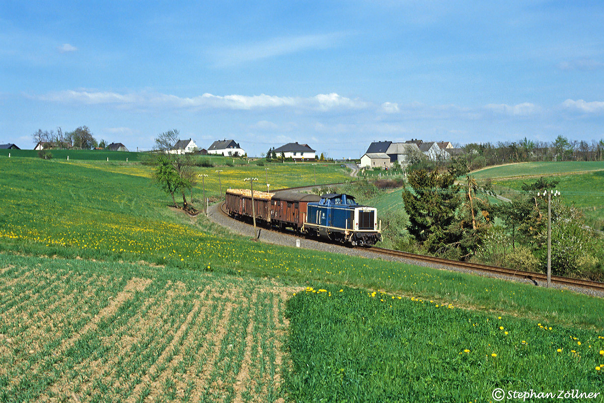 Anfang der 1990er Jahre fand die Güterbedienung der Eifelquerbahn zweigeteilt statt. Auf dem Westabschnitt fuhr von Montag bis Freitag eine Trierer 211 ab Gerolstein hinauf bis nach Uersfeld. Am sonnigen Nachmittag des 02. Mai 1990 entstand diese Aufnahme von 211 035, die mit drei Wagen in der großen Kurve bei Höchstberg den Berg herunter auf Ulmen zurollt.