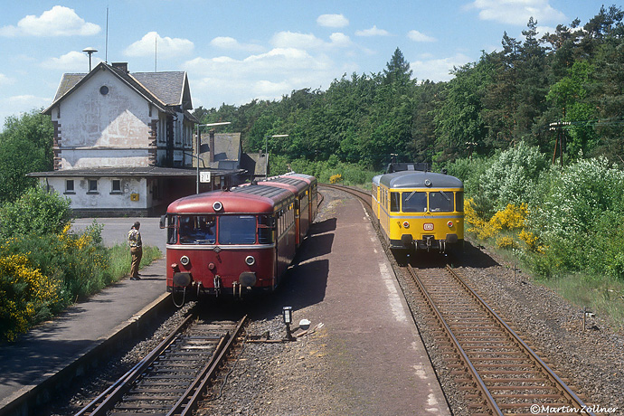 Die am 29. Mai 1990 von Mayen West wegen Reparaturarbeiten an der Messmechanik erst mittags mit Verspätung zurückkehrende Gleismessfahrt hatte im Bahnhof Uersfeld eine außerplanmäßige Zugkreuzung mit dem Schülerschienenbus Nto 7073 nach Kaisersesch. Nach Genehmigung auf dem kleinen Dienstweg durch das Zugpersonal konnte als erhöhter Fotostandpunkt die einzige dort stehende Bahnhofslaterne geentert werden.