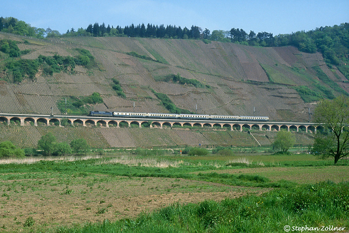 Der Maifeiertag 1989 wurde bei sonnigem Wetter fototechnisch an der Mosel verbracht. Auf der Moselstrecke verkehrten damals noch die hochwertigen Schnellzüge mit den Zweisystem-Lokomotiven der BR 181.2, wie der D 2152 von Koblenz nach Saarbrücken. Gegen 11.00 Uhr überquerte dieser gen Wittlich fahrend den Pündericher Hangviadukt mit einer unbekannten blauen Lok.