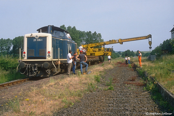 Am Vormittag des 15. Juni 1989 wurden die letzten Gleisreste des ehemaligen Bahnhofs Hasborn beseitigt. Noch vor der Frühstückspause wird nur noch eine Schotterwüste übrig bleiben.
