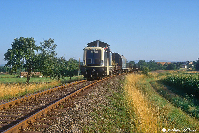 Am frühen Freitagmorgen des 20. Juli 1990 war die Trierer 211 065 mit dem Abbauzug auf der Liesertalbahn unterwegs nach Lieser-Mülheim. Noch vor dem Wochenende konnte so die stillgelegte Trasse um weitere 200 Meter ihrer Gleise beraubt werden um Platz für den obligatorischen Radweg zu schaffen. Aufnahme in den Wiesen und Feldern kurz hinter dem Startbahnhof.