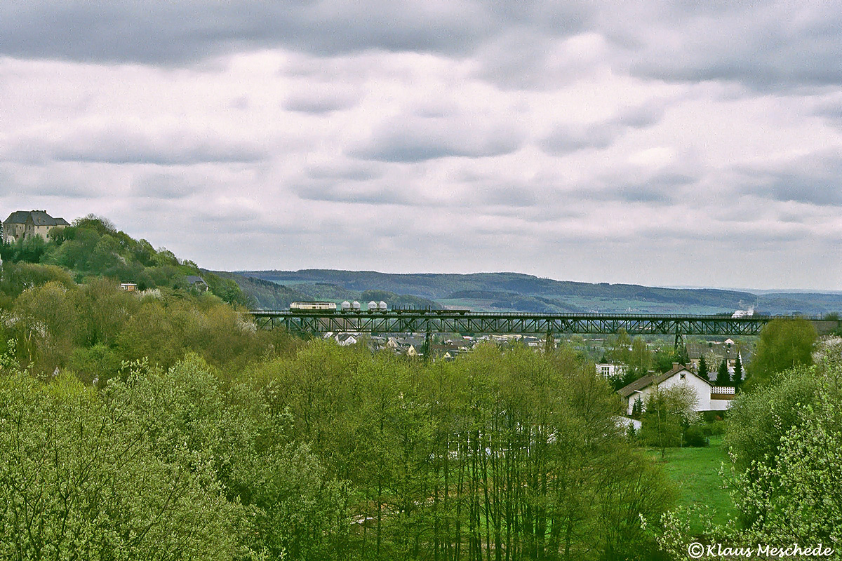 Höhepunkt der Westerwaldquerbahn von Herborn nach Montabaur ist sicherlich die 1906 errichtete Hülsbachtalbrücke über den Dächern von Westerburg. Im Jahr 1987 verkehrte die Übergabe nach Rennerod noch mit der BR 216 über das Bauwerk, welche Klaus Meschede an einem bedeckten Tag im Mai mit der Gießener 216 107 auf seinem Diafilm bildlich festhalten konnte.
