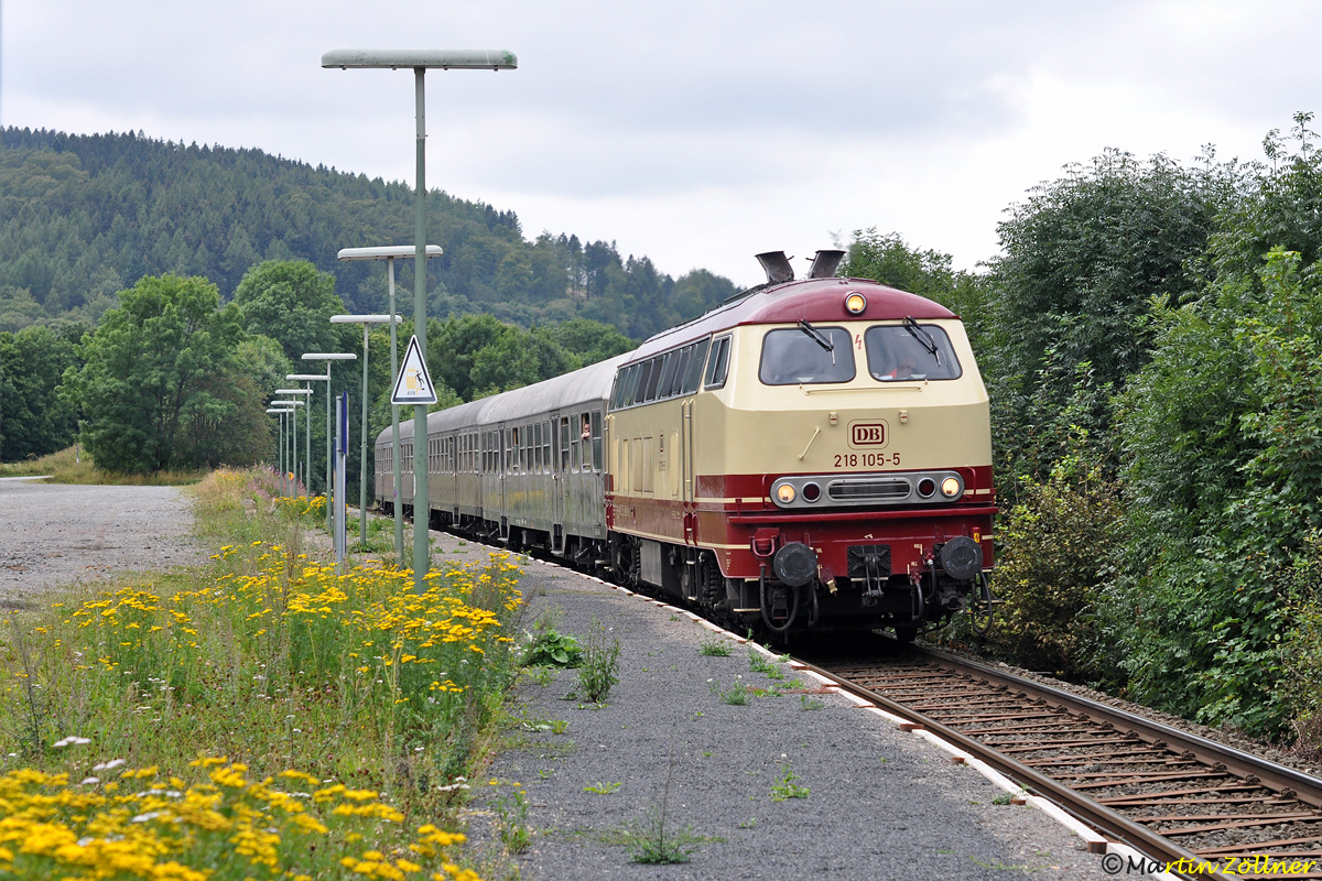 Nur an zwei Tagen im Jahr halten im "Weltcup-Bahnhof" Stryck bei Willingen Reisezüge. Am 01. September 2012 ist jedoch kein Skisprungweltcup auf der Mühlenkopfschanze angesetzt, sodass die in TEE-Farben lackierte 218 105 der DB-Westfrankenbahn mit ihrem Sonderzug zum Kurhessenbahn-Streckenfest 2012 den mit gebrauchtem Material im Stil der achtziger Jahre angelegten Haltepunkt ohne Stopp durchfährt.