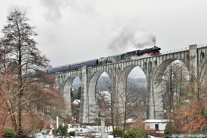 Vom 25.02. bis 02.03.2017 fand die "Große Winterfahrt" der IGE mit verschiedenen Dampfloks durch ganz Deutschland statt. Die 5. Etappe führte am 01. März von Kassel über Brilon Wald, Marburg, Gießen und Alsfeld nach Fulda. Peter Schierschke konnte 41 096 mit dem DPE 20098 auf dem Willinger Viadukt für die Nachwelt bildlich festhalten.