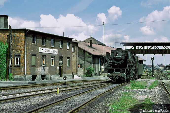 Am schönen 17. Juni 1975 besuchte Klaus Meschede unter anderem auch das fränkische Bw Crailsheim. Neben der Lokleitung konnte er die hier heimische 023 002 bei einer Rangierfahrt zu den Behandlungsanlagen aufnehmen. Schon drei Monate später musste die Maschine am 29. September wegen loser Radreifen abgestellt werden. Sie kam nicht mehr in Fahrt, die Ausmusterung erfolgte zum 30. Oktober des gleichen Jahres.