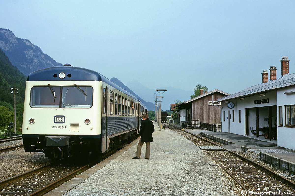 Bei ihrer Anlieferung 1974 waren die Triebwagen der BR 627 noch mit Mittelpufferkupplung ausgestattet und wurden später in den Jahren 1984 ⁄ 85 auf normale Zug- und Stoßeinrichtung umgebaut. Am 11. Juni 1976 konnte Klaus Meschede 627 002 zusammen mit einem 628.0 auf der Außerfernbahn in Pfronten Steinach als Nt 5457 nach Garmisch-Partenkirchen beim Aufenthalt fotografieren.