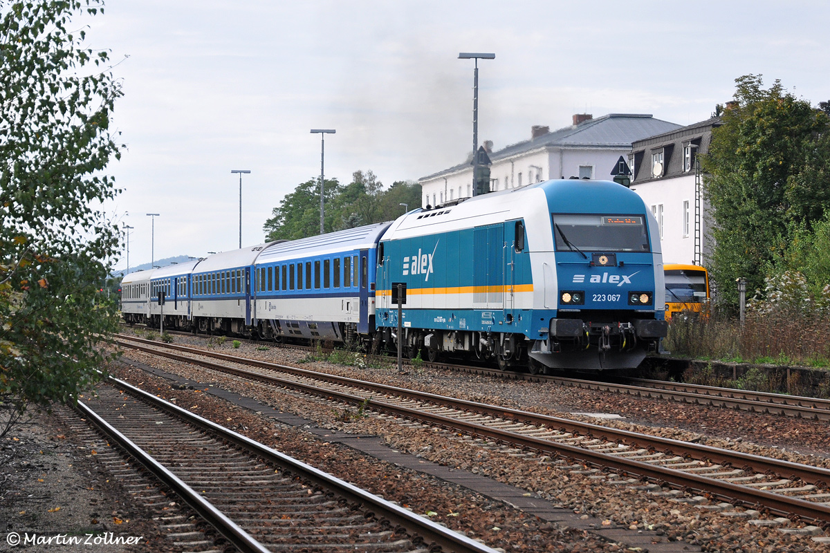 Auch im Jahre 2014 existiert über den Grenzübergang Furth im Wald noch eine internationale Schnellzugverbindung. Heuer wird der Zug von München nach Prag auf deutscher Seite mit der Zuggattung ALX, auf tschechischer Seite als EC geführt. Mit dem aus tschechischem Wagenmaterial gebildeten ALX ⁄ EC 355 beschleunigt 223 067 der Vogtlandbahn am 24.09. in Cham Richtung Furth im Wald.