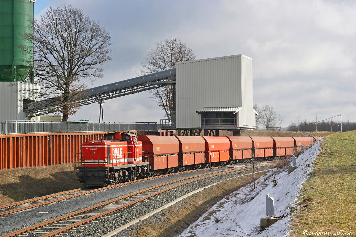 Am 04. März 2010 war der schwere Deutz-Sechsachser 38 (KHD 58252 ⁄ 1970) für die Beladung des Brühnezuges am Warsteiner Lohbusch eingeteilt. Nach Nebelauflösung wird in der Morgensonne gerade der vierte (von ONRail gemietete) Falns-Wagen mit seiner staubigen Fracht befüllt.