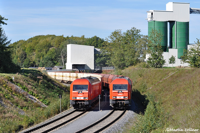 Aufgrund von Fristarbeiten an der Bierzug-Stammlok WLE 21 konnten am 22. September 2010 die beiden WLE-Eurorunner an der Kalksteinmehlverladung Lohbusch bei Warstein bildlich nebeneinander verewigt werden, was nur äußerst selten gelingt. Während WLE 22 mit nicht sichtbarer Schubunterstützung von WLE 72 den Münchener Biercontainerzug befördert, steht daneben WLE 23 mit dem Brühnezug nach Oberhausen in der Beladung.