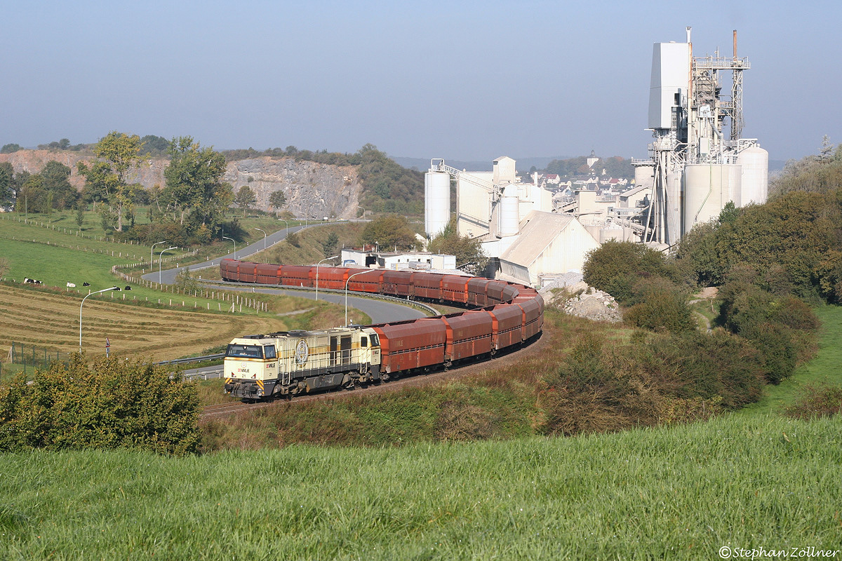 Drei "Anläufe" waren nötig, um den leeren Brühne-Kalkmehlzug in der großen S-Kurve auf der Warsteiner Brauereianschlussbahn mit den Industrieanlagen im Hintergrund im Sonnenschein aufzunehmen. Am 28. September 2011 hat es dann endlich geklappt und dann mit der Lok 21 auch noch mit einer eher seltenen Bespannung.