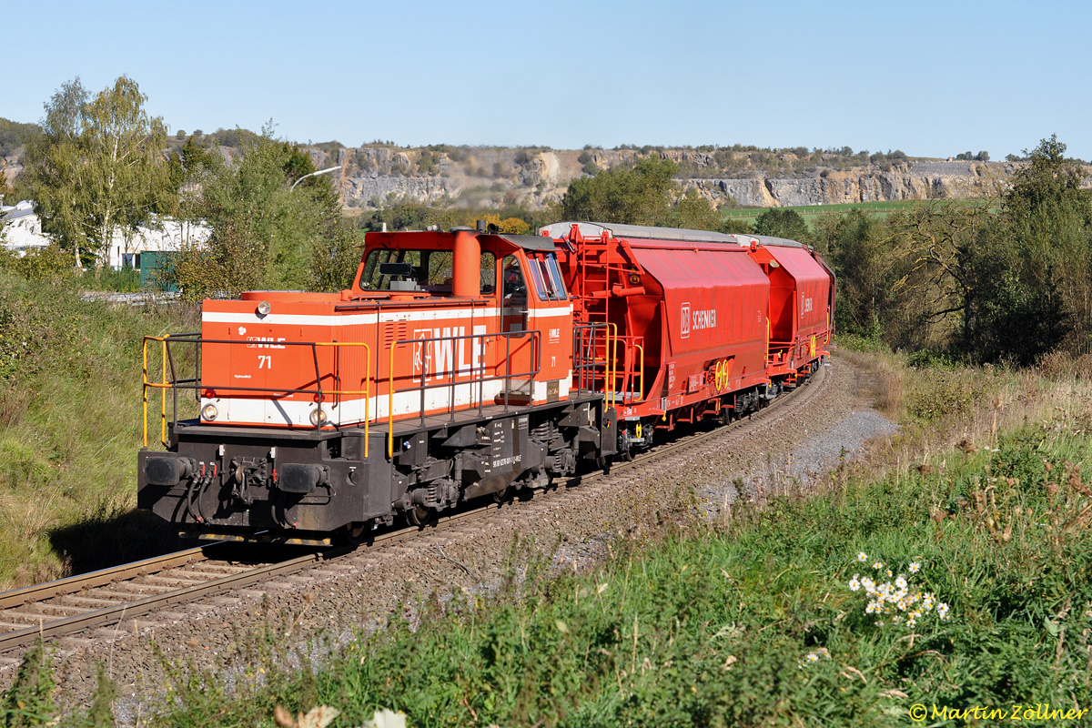 Mit einer Fuhre Malz erklimmt WLE 71 am 30. September 2011 den Scheitelpunkt der Brauereianschlußbahn beim Enkerbruch. Als Hintergrundkulisse diente dabei der weithin sichtbare Warsteiner Steinbruch Hohe Lieth.