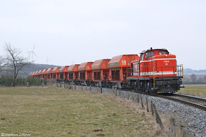Am 03. April 2013 wurde nach langer Zeit mal wieder ein "Kontrollbesuch" bei der WLE eingelegt. Während auf der Möhnetalbahn nach Rüthen kein Schienenfahrzeug gesichtet werden konnte, ließ sich am Effelner Weg in Belecke gegen viertel nach Drei wenigstens –wenn auch bei inzwischen zugezogenem Himmel– WLE 38 mit einem Kalksteinzug Richtung Beckum blicken.