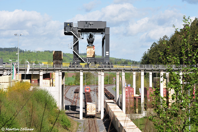 Immer dichter werdender Bewuchs am Warsteiner Brauereigelände ermöglicht kaum noch die bildliche Dokumentation der Containerverladung im dortigen Werksbahnhof. Am 06. Mai 2015 ist gerade noch ein Durchblick auf die Beladung des Berliner Bierzuges möglich. Während die erste Zughälfte schon beladen ist, bugsiert die funkferngesteuerte WLE 23 die nächsten Tragwagen unter die Verladebrücke.
