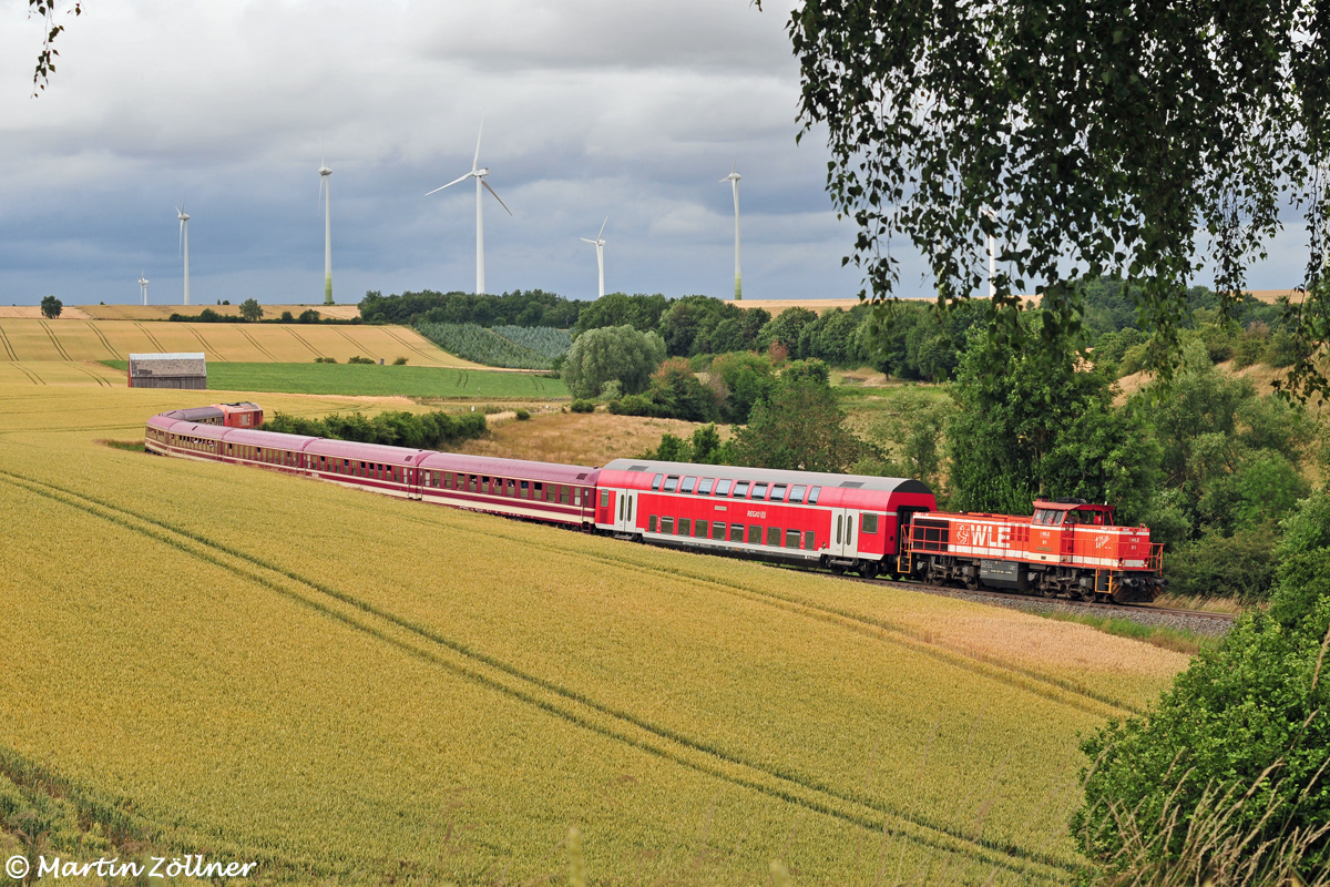 Am Nachmittag des 08. Juli 2019 kehrt das Europa-Gymnasium Warstein mit dem eigens gecharterten Sonderzug von Münster in den Heimatort zurück. In Lippstadt hat WLE 51 die Zugförderung der illusteren Wagengarnitur übernommen, am Zugschluß wird WLE 22 weiter mitgeführt. Nach Überqueren des Haarstrangscheitels an der Betriebsstelle Brechpunkt rollt der Zug hier Nähe Drewer das steilste Stück des Westfäischen Semmerings herunter auf Belecke zu.