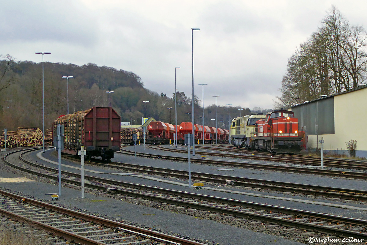 Durch die intensive Borkenkäferholzverladung ist der Bahnhof Warstein Anfang 2020 immer recht gut mit Snps- und Roos-Wagen gefüllt. Am Samstagnachmittag, den 18.01. wurde versucht, das fotomäßig zu dokumentieren, was aber durch die vielen Masten, Schilder und Schlüsselschalter schwierig ist. WLE 62+21 rückten jedenfalls gegen 15.45 Uhr gerade zur Wochenendruhe in den Schuppen ein, daneben stehen zwei Leergarnituren aus dem noch ruhenden Steinzugverkehr abgestellt.