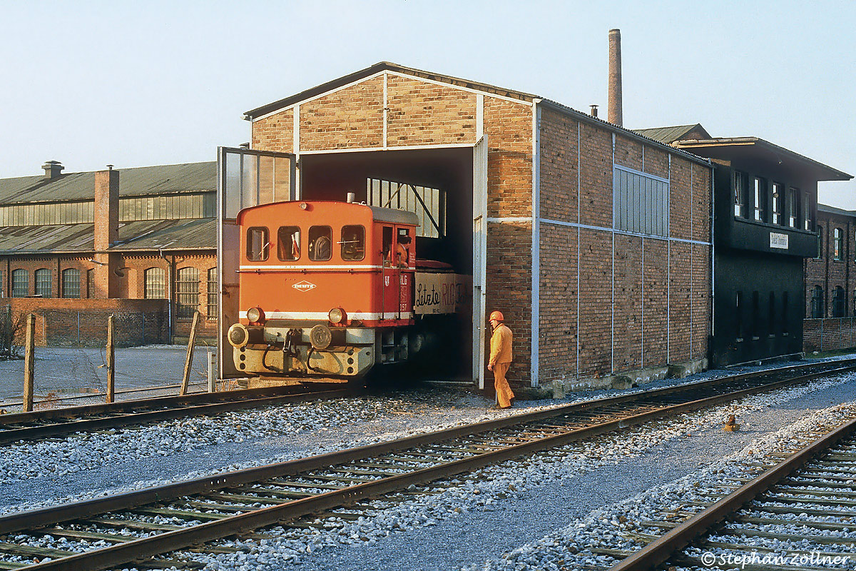 Zum letzten Mal rückt die Soester Ortslok RLG 57 in ihr Domizil in Thomätor ein. An diesem 30. Dezember 1987 endete die Betriebsführung auf dem Möhnetalbahnabschnitt Soest DB – Soest Süd durch die Ruhr-Lippe-Eisenbahn. Bis Ende 2001 oblag dann hier DB Cargo der Restgüterverkehr.