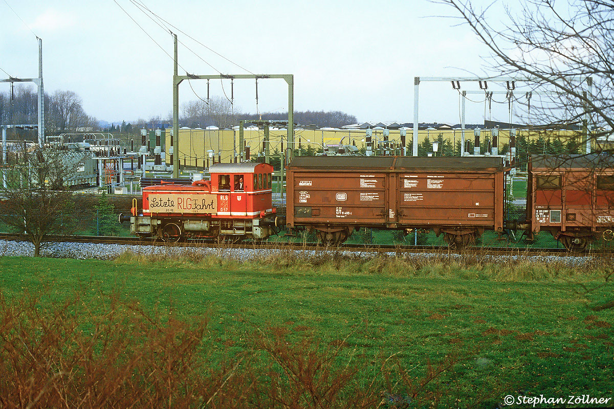 Am Umspannwerk Lange Wende schiebt RLG 57 am letzten Tag unter RLG-Betriebsführung die Üg 7 von Thomätor auf der Möhnetalbahn zur Gla Kunert herauf und wurde dabei auch von den Zöllners mit Film- und Fotokameras beobachtet. Aufnahme vom 30. Dezember 1987.