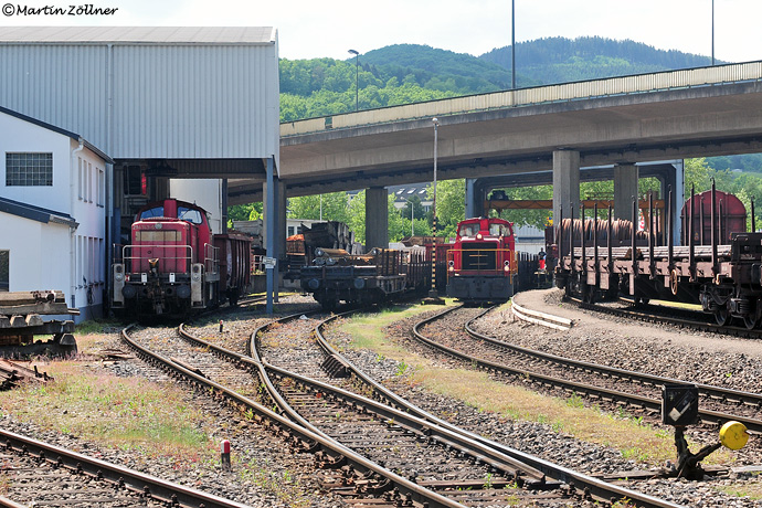 Am Nachmittag des 14. Mai 2018 ist die MEG-eigene Lok 25 (MaK 500046 ⁄ 1967) mit Rangierarbeiten im Umschlagbahnhof Plettenberg Mitte beschäftigt, während die mit MEG-Personal zwischen Finnentrop und Elverlingsen eingesetzte DB Cargo-294 743 an diesem Tag bereits zur Nachtruhe ebendort abgestellt ist.