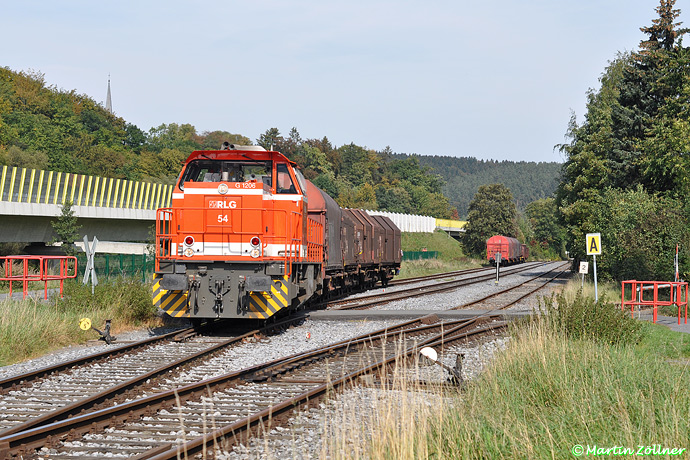 Im Zuge der Versorgung mit Stahlcoils rangiert RLG 54 am 26. September 2011 gerade von Gla Schulte kommend eine zweite Charge Leerwagen in Neheim-Hüsten West nach Gleis 3, wo an diesem Tag die Abgangswagen gesammelt werden. Die Sperrfahrt 28 wird als Lz nach Neheim-Hüsten Ue weitergeführt, um von dort die letzten drei beladenen Haubenwagen des Tages nach Stahlform Schulte zu bringen.