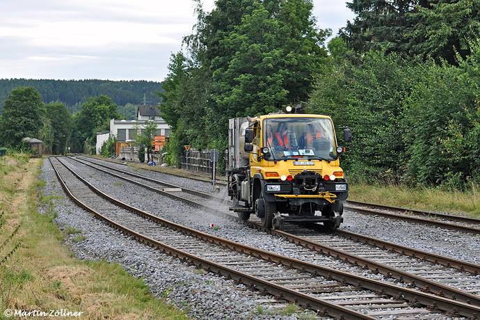 Am 28. August 2012 steht auf der Röhrtalbahn die chemische Aufwuchsbekämpfung an. Der U 400 der Dülmener Firma Kemming konnte hier in voller Aktion am Bahnübergang im Bahnhof Neheim-Hüsten West bildlich festgehalten werden. Auch die Nebengleise wurden gegen resultierende Humusbildung im Schotterbett behandelt.