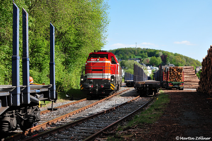 Am Nachmittag des 05. Mai 2020 übernahm RLG 57 im Schwerter Güterbahnhof einen 511 Meter langen Leerwagenganzzug aus Ingolstadt und beförderte ihn nach Sundern zur Beladung mit Borkenkäferholz. Die Aufnahme zeigt den Beginn der umfangreichen Rangierarbeiten zur Bereitstellung der Leerwagen an den beiden Ladestraßengleisen. Aufgrund der vorhandenen Bahnhofsgleislängen werden hierzu alle Nebengleise im Endbahnhof in Anspruch genommen.