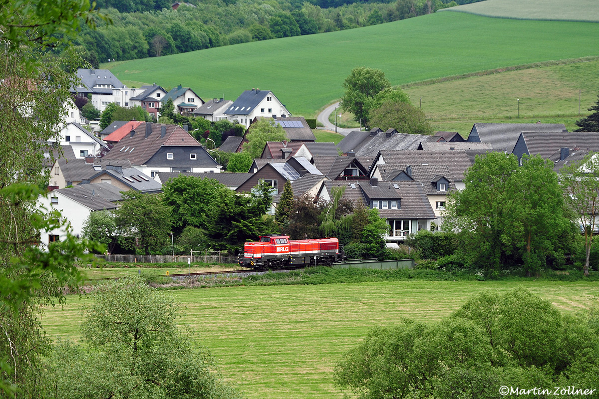 Im Rahmen der Käferholzverladungen auf Ganzzüge in Sundern sind auch am frühen Nachmittag des 22. Mai 2020 an der Ladestraße des Endbahnhofs der Röhrtalbahn einige beladene gegen leere Wagen zu tauschen, um den kompletten Umschlag von LKW auf die Schiene zu ermöglichen. Auf dem Rückweg von den Rangierarbeiten quert RLG 57 soeben die Obergrabenbrücke vom Sophienhammer Müschede (heute Cronenberg) und wurde dabei vom Ölberg aus beobachtet.