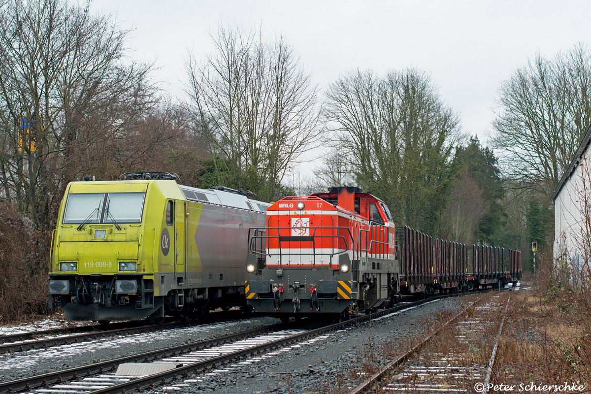 Am 27. Januar 2021 wurde der Bahnhof Hachen mal wieder mit Leerwagen für die Langholzabfuhr versorgt. Peter Schierschke nahm den Zug mit Lok RLG 57 in Neheim-Hüsten West bei der Vorbeifahrt neben der mangels Abstellgelegenheit in Holzwickede hier zwischengeparkten 119 009 der Holzlogistik Bebra auf.
