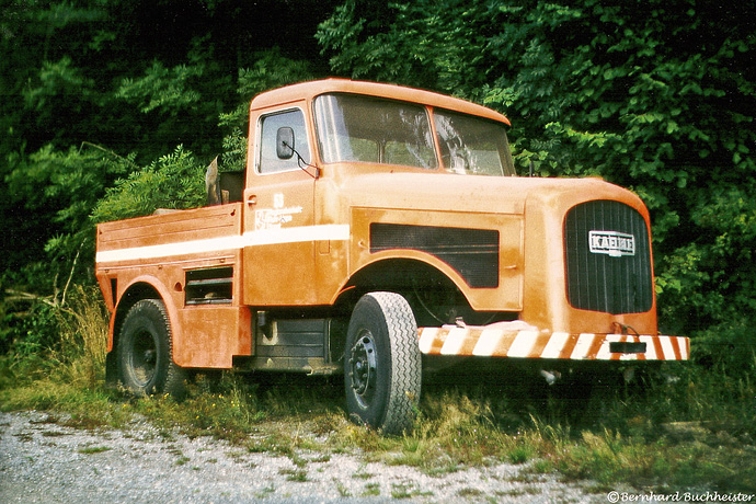 Diese Aufnahme unbekannten Datums zeigt die bereits arg "gerupfte" Kaelble Nr. 53 in der Botanik vor dem Sunderaner Lokschuppen. Deutliche Unterscheidungsmerkmale zur Kaelble Nr. 54 sind die oberhalb des Eigentümerschriftzuges angebrachte Betiebsnummer 53 (bei Kaelble Nr. 54 unterhalb des Zierstreifens) sowie das separat angebrachte Rundumlicht, hier bereits nicht mehr vorhanden (bei Nr. 54 mittig auf dem Führerhaus).