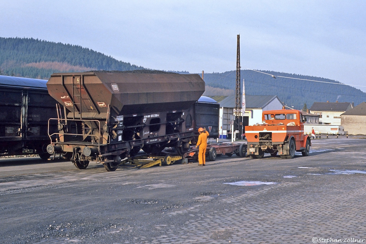 Am 27. Dezember 1989 war vor dem nächsten Wintereinbruch ein Fc-Wagen zur "Bäuerlichen" mit 25 Tonnen Heiznachschub in Form von Eierkohlen für die heimischen Öfen nach Westenfeld zu transportieren. RLG 54 nahm sich noch am Vormittag der Sache an, hier beim Auflasten auf den Cometto 106 im Bahnhof Sundern aufgenommen.