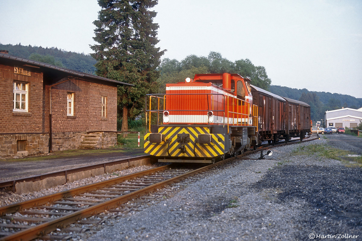 Nachdem RLG 67 am 08. Juni 1990 abends im Rahmen eines Sonderdienstes einige Ausstellungsgüterwagen für das Bahnhofsfest zum 90-jährigen Röhrtalbahn-Streckenjubiläum nach Sundern gebracht hat, wird die Rückfahrt nach Neheim gleich noch genutzt, um in Stemel in das damals noch vorhandene Nebengleis der Fa. Brenscheidt zwei Gbs-Wagen bereitzustellen.