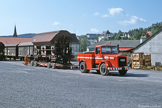 Vor der Abfahrt wird noch die Ablauframpe entfernt sowie die Heckwarntafeln angebracht. Nach einem Beleuchtungscheck kann die Fahrt zur Hans-Martin-Schleyer-Straße beginnen. Aufnahme des Gespanns mit RLG Kaelble 52 am 06. August 1990 im Bahnhof Sundern.