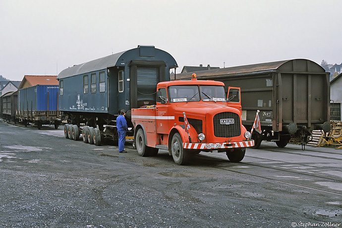 Auch ungewöhnliche Aufträge hatten die RLG-Straßenroller zu erledigen. Für die Spedition Thüsing kam im November 1990 ein neues Büro in Form dieses ausgemusterten DB-Umbaudreiachsers am Bahnhof Sundern an. Bild kurz vor der Abfahrt des fertigen Transportes zum Dümpel, wo mittels Autokran abgeladen wurde. Wer hier der Chef ist, machen die zwischenzeitlich angefertigten Schilder unmissverständlich deutlich.