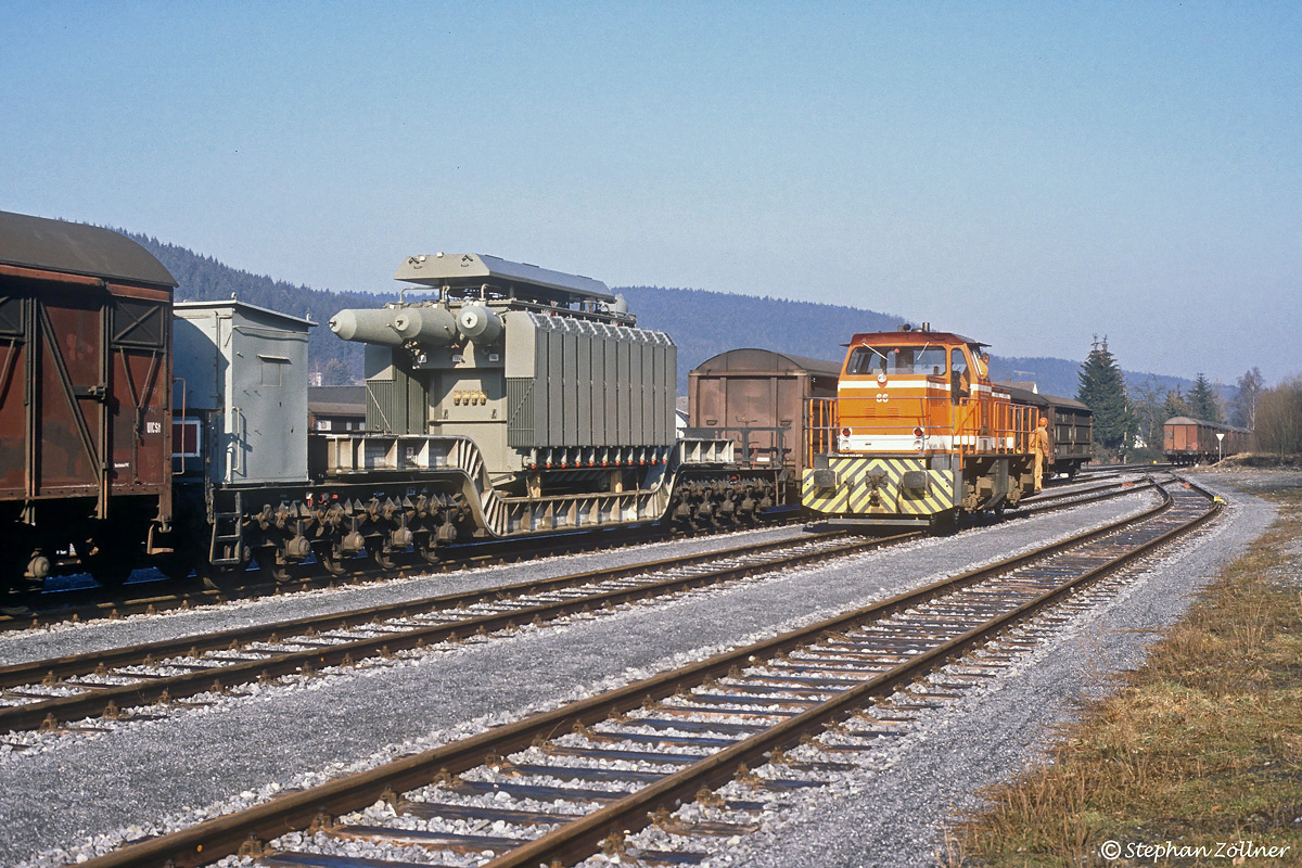 Die 110 kV-Transformatoren für das Umspannwerk Sundern wurden noch Anfang der neunziger Jahre per Bahn bis zum Bahnhof Sundern angeliefert und dort auf einen Schwertransporter umgeladen. Am 04. März 1991 findet nochmals ein solcher Transport statt. RLG 66 hat am 27. Februar den morgendlichen Ng 401 bei der Ankunft am Endbahnhof aufgrund der Zuglänge geteilt und wird nun den 2. Teil zwecks Umsetzen nach Gleis 3 ziehen, daneben das Uaai 571.9-Einzelstück 33-80-995 0 000-5.