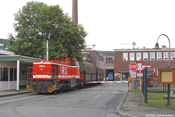 Am 09.07.2009 rangiert RLG 54 mit Kraftwerkskohle in Falns-Wagen am Streckenende in der Wetterhofstraße zum Tiefbunker. Bis zur Eröffnung der Bahnlinie durch das Alte Feld fuhren hier einst die Züge durch die Stadt zum Arnsberger Bahnhof. Nach zwei Besitzwechseln firmiert das ehemalige Feldmühle-Werk heute unter Reno de Medici.