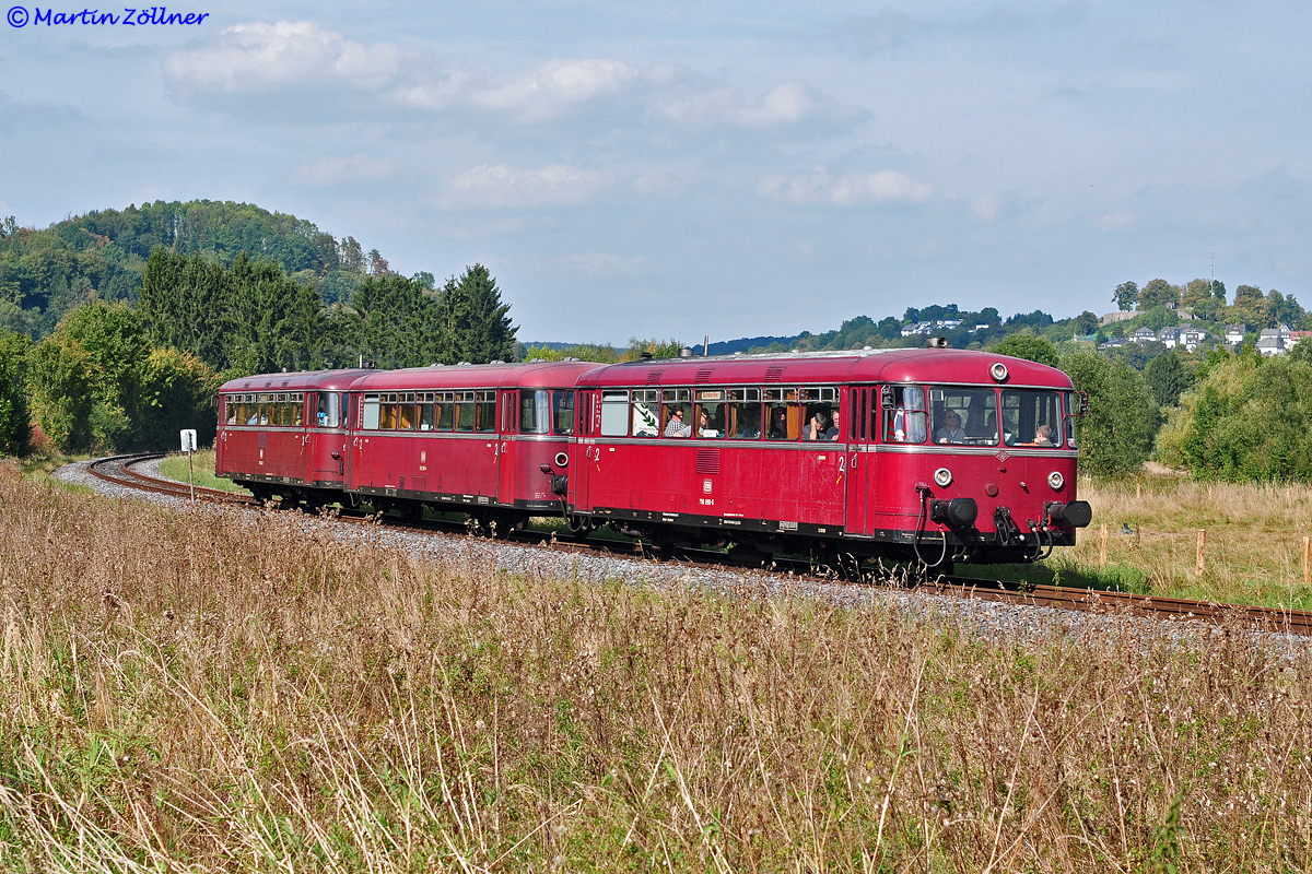 Auf der Ruhr-Lippe-Kleinbahnstrecke durchs Alte Feld in Arnsberg ist nur sehr selten ein Sonderzug unterwegs. Am Nachmittag des 24. September 2016 herrschte eitel Sonnenschein, als die dreiteilige Schienenbusgarnitur des FSB Menden im Rahmen einer Studienfahrt auf Höhe des Segelflugplatzes dort entlangrollt. Den passenden Hintergrund bilden links der Alte Burgberg und rechts der Schloßberg mitsamt Schloßruine.