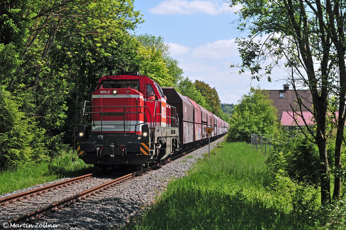 Am 15. Mai 2020 findet sich eine schattige Fotostelle für den Leerkohlezug mit Teilziel Schwerte am Kohlgrubenweg bei Bruchhausen. Mit langer Leine rollt RLG 57" vorüber. Der Zug wird von Schwerte bis zum Amsterdamer Hafen von DB Cargo traktioniert.