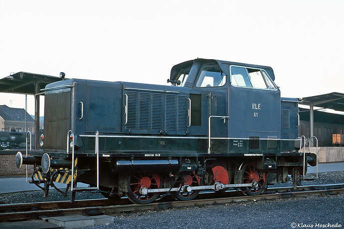 Am 16. Juli 1976 erhielt die am 10.04.1975 zur RLE gewechselte Lok 61 eine Hauptuntersuchung und behielt dabei die blaue Farbgebung ihres Voreigners WLE. Klaus Meschede lichtete die Maschine zwei Monate später am Lokschuppen in Neheim-Hüsten RLG ab.